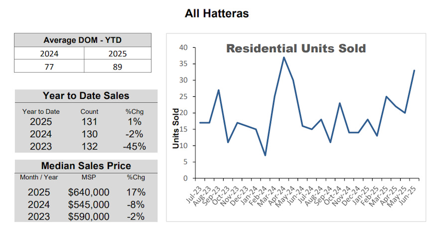 As you can see above, home prices on Hatteras Island in 2024 actually dropped vs 2023. But so far this year they are not only back to 2023 levels, the median sales price is $50k higher than those 2023 levels. Sales volume is steady across all 3 years, while homes are lingering a little longer on the market. I think the $640k median sales price is quite reasonable when you compare it to areas like Duck (almost $1m) or Corolla ($815k).